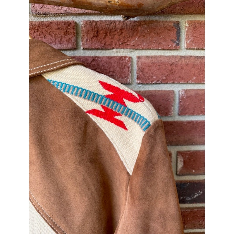 Elevate your style with this unique Pioneer Wear Chimayo wool blanket suede leather jacket! Crafted with high-quality suede, this jacket features intricate Chimayo-inspired detailing, making it a standout piece for any wardrobe. Please refer to photos for measurements and condition.